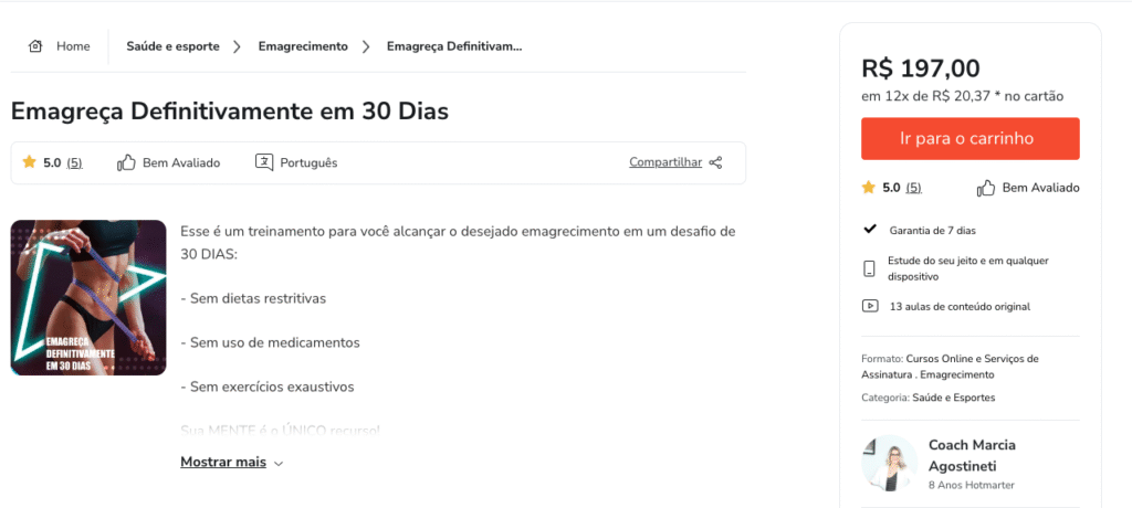 Você receberá o acesso a Emagreça Definitivamente em 30 Dias por email. Pode ser um curso online, um ebook, uma série de videoaulas, um serviço, evento, etc. O conteúdo será acessado ou baixado através de um computador, celular, tablet ou outro dispositivo digital. Você também pode acessar o produto comprado nesta página: